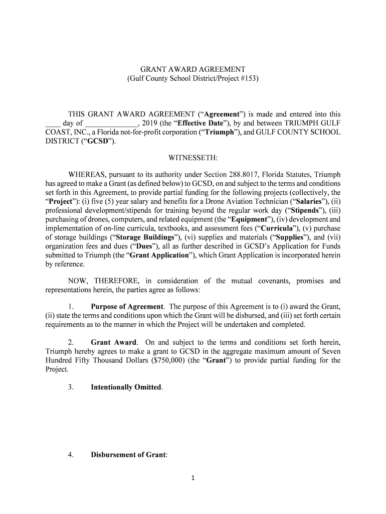 GRANT AWARD AGREEMENT (Gulf County School District/Project #153)THIS GRANT AWARD AGREEMENT (Agreement) is made and entered into this day of, 2019 (the Effective Date), by and between TRIUMPH GULF
