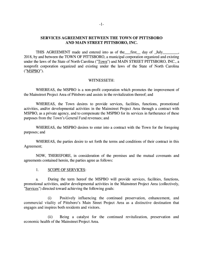 1SERVICES AGREEMENT BETWEEN THE TOWN OF PITTSBURGH AND MAIN STREET PITTSBURGH, INC. THIS AGREEMENT made and entered into as of the first day of July 2018, by and between the TOWN OF PITTSBURGH, a