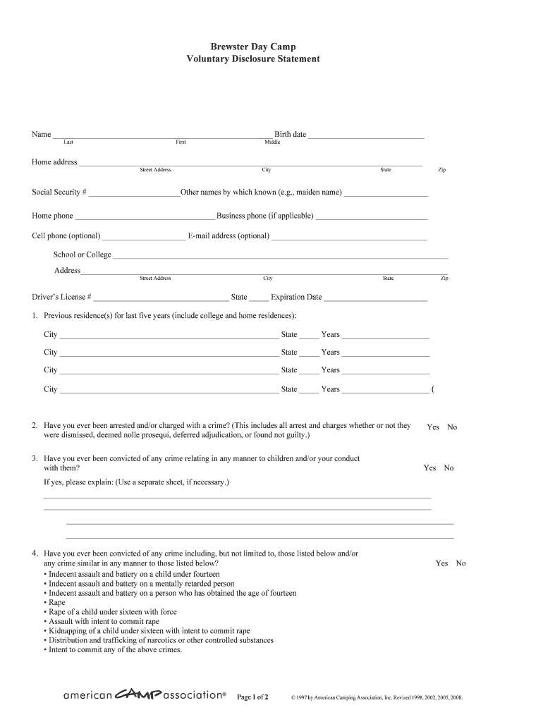 Brewster Day Camp Voluntary Disclosure StatementName Birth date LastFirstMiddleHome address Street AddressCityStateZipSocial Security # Other names by which known (e.g., maiden name) Home phone Business