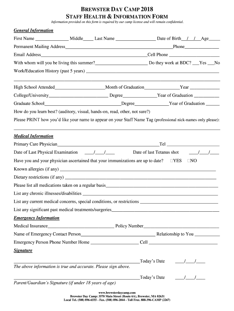 Get the free BREWSTER DAY CAMP 2018 STAFF HEALTH INFORMATION FORM