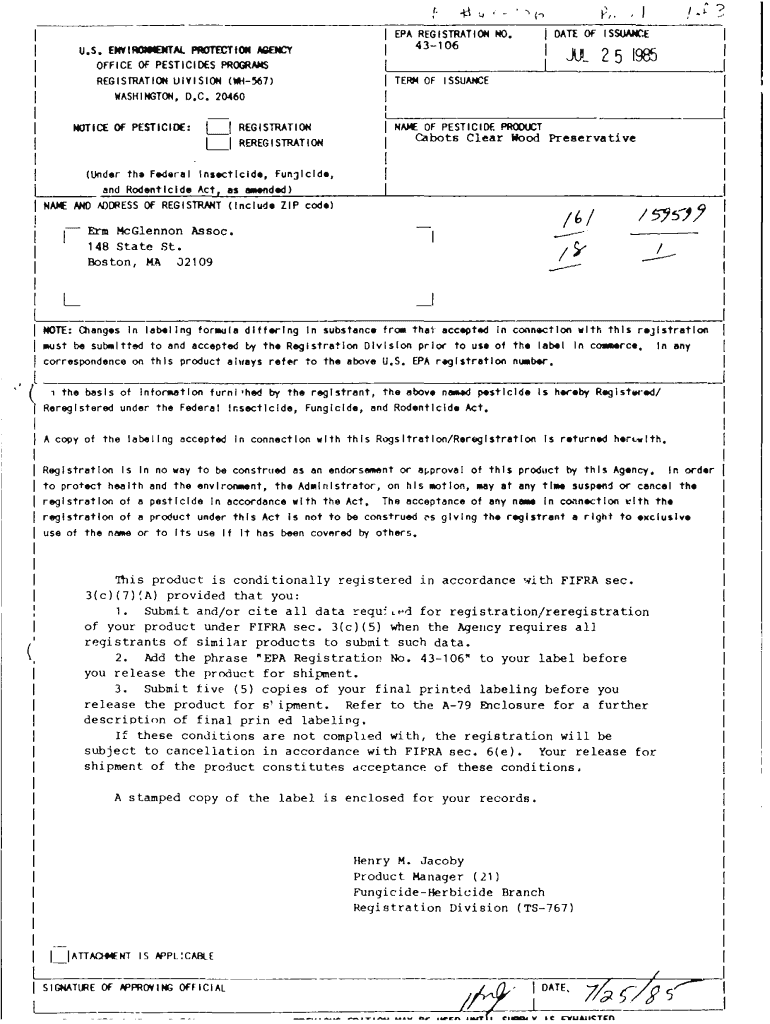 .r. I I I I I I I I I IPA REGISTRATION NO.25 1985OFFICE OF PESTICIDES PROGRAMS REGISTRATION DIVISION (MH567)TERM OF ISSUANCEWASHINGTON. D.C. 2G460NOT “: Of PESTICIDE:(Under the F.ralLI43106U. S.