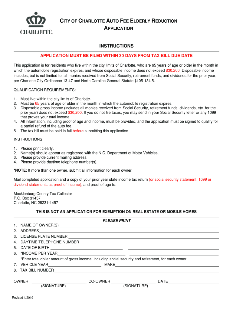 CITY OF CHARLOTTE AUTO FEE ELDERLY REDUCTION
