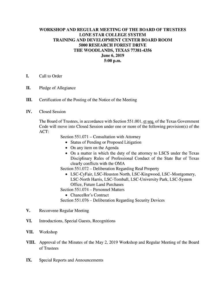 WORKSHOP AND REGULAR MEETING OF THE BOARD OF TRUSTEES