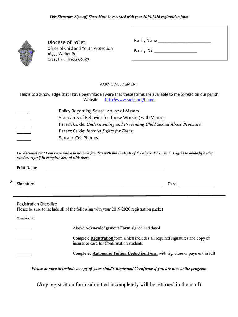 This Signature Sign off Sheet Must be returned with your 20192020 registration formDiocese of JolietFamily Name Office of Child and Youth Protection 16555 Weber Rd Crest Hill, Illinois 60403Family