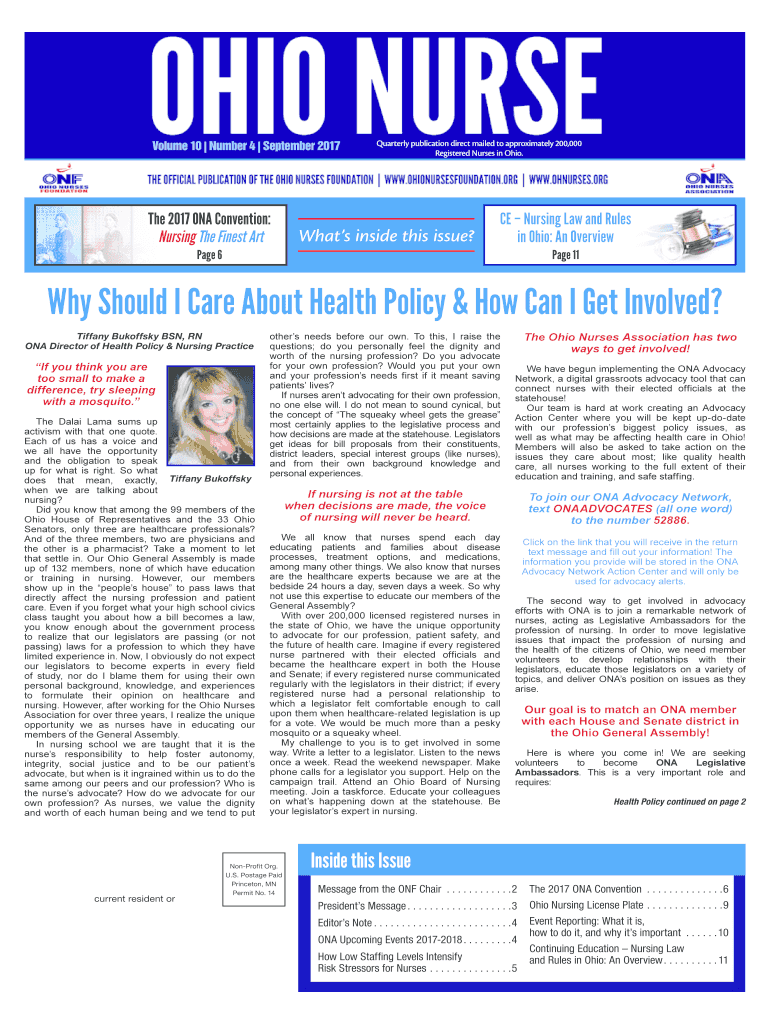Volume 10 Number 4 September 2017The 2017 ON Convention: Nursing The Finest Quarterly publication direct mailed to approximately 200,000 Registered Nurses in Ohio. What's inside this issue?CE Nursing