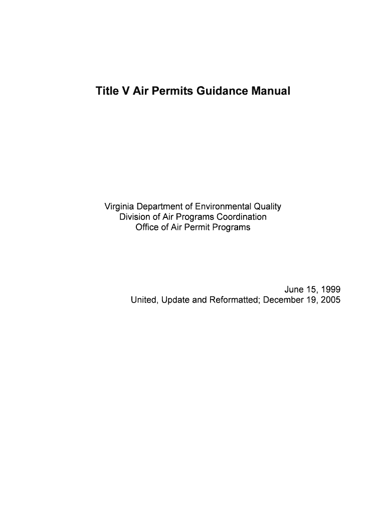 Title V Air Permits Guidance Manual Virginia Department of Environmental Quality Division of Air Programs Coordination Office of Air Permit Programs June 15, 1999, United, Update and Reformatted;