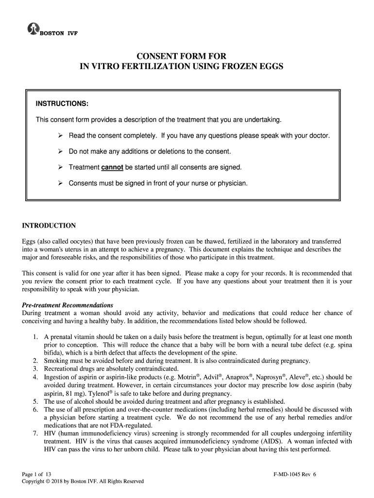 BOSTON CONSENT FORM FOR IN VITRO FERTILIZATION USING FROZEN EGGSINSTRUCTIONS: This consent form provides a description of the treatment that you are undertaking. Read the consent completely. If you