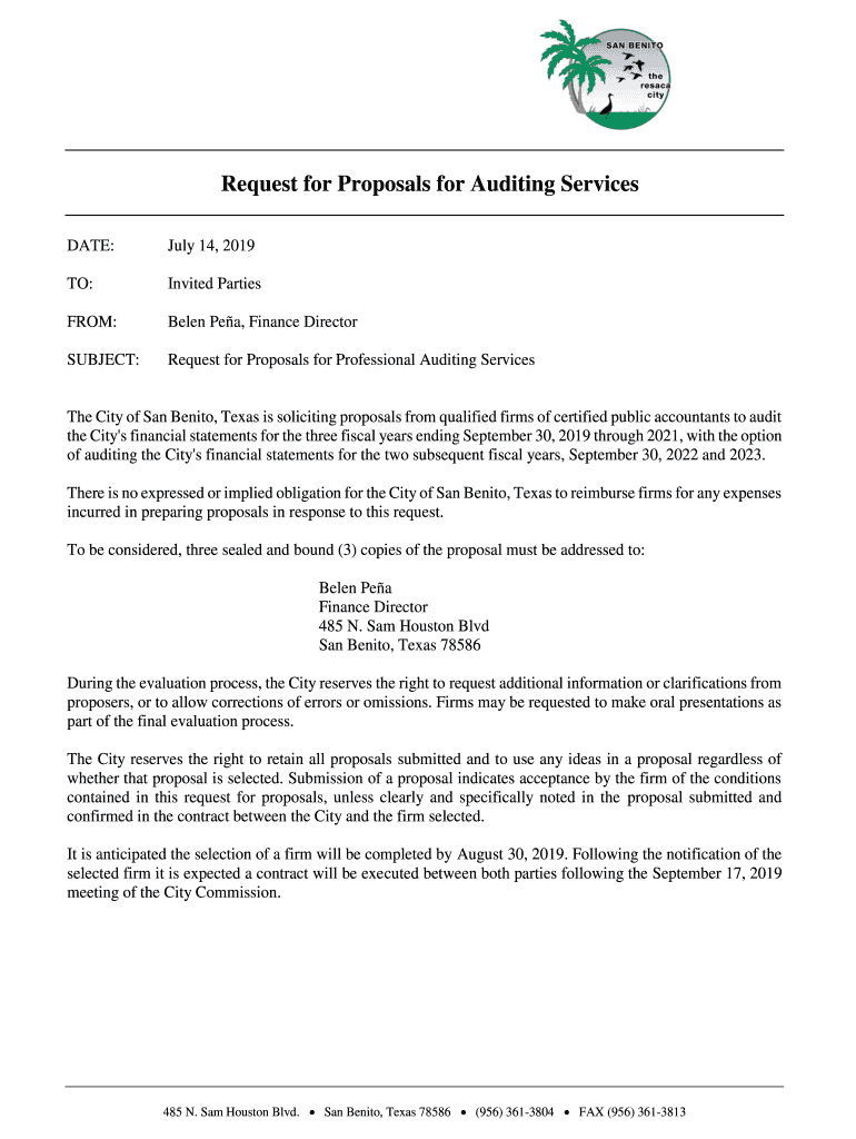 DATE:July 14, 2019TO:Invited PartiesFROM:Been Pea, Finance DirectorSUBJECT:Request for Proposals for Professional Auditing Services City of San Benito,