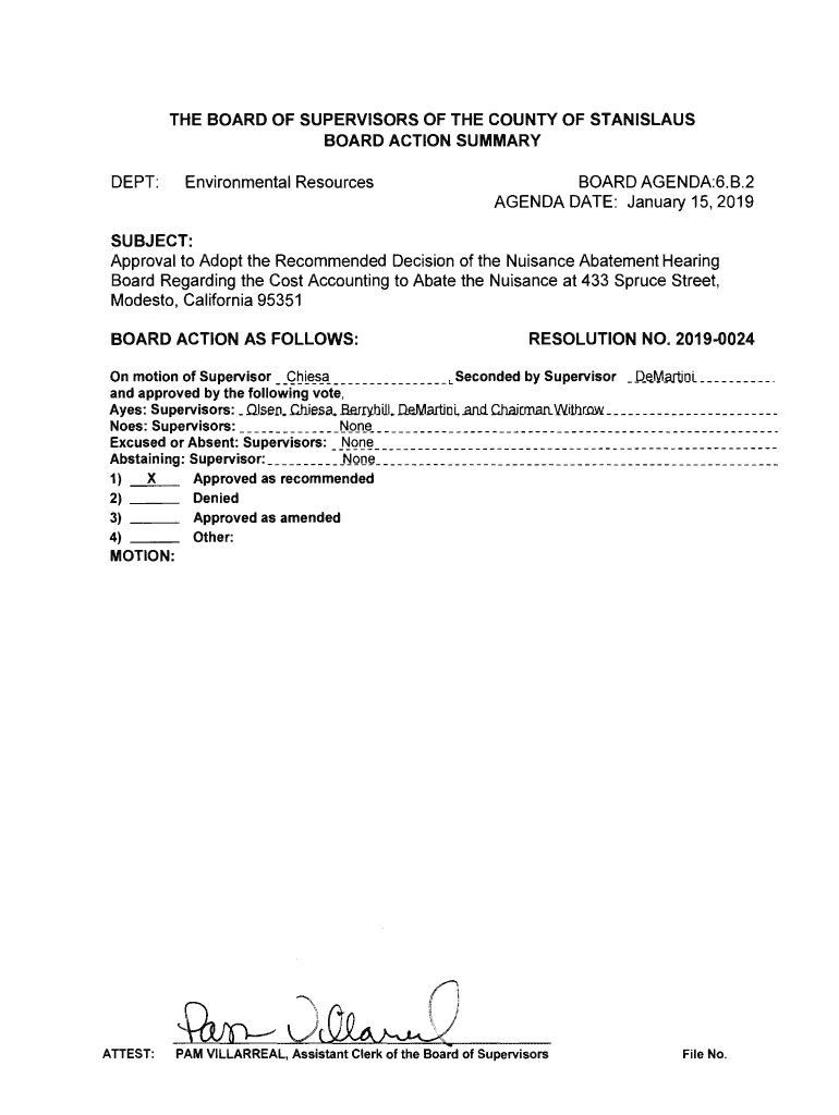 THE BOARD OF SUPERVISORS OF THE COUNTY OF STANISLAUS BOARD ACTION SUMMARY DEPT:Environmental ResourcesBOARD AGENDA:6. B.2 AGENDA DATE: January 15, 2019SUBJECT: Approval to Adopt the Recommended Decision