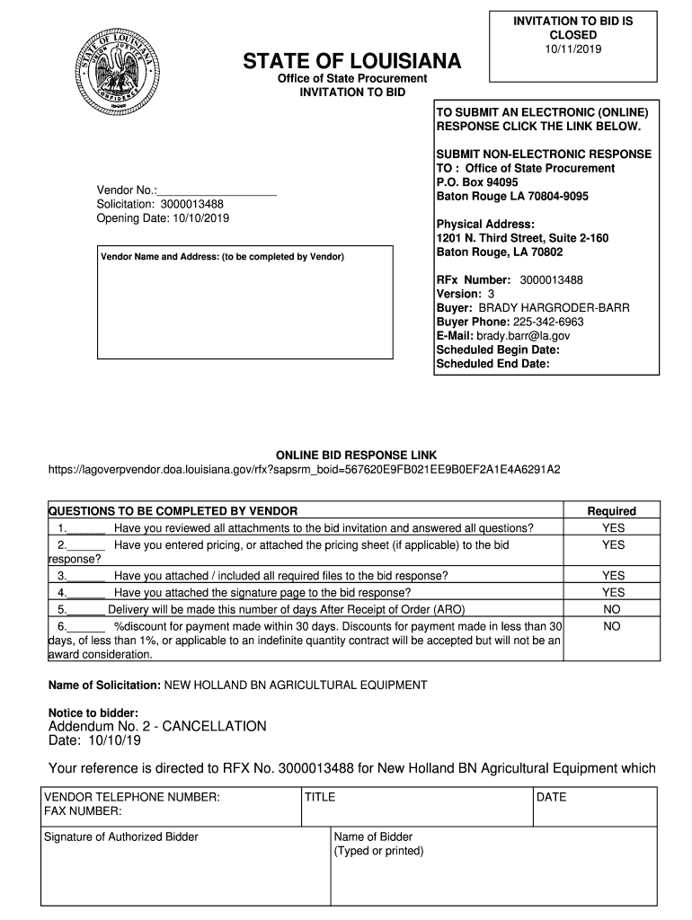 STATE OF LOUISIANAINVITATION TO BID IS CLOSED 10/11/2019Office of State Procurement INVITATION TO BID TO SUBMIT AN ELECTRONIC (ONLINE) RESPONSE CLICK THE LINK BELOW. SUBMIT NONELECTRIC RESPONSE TO