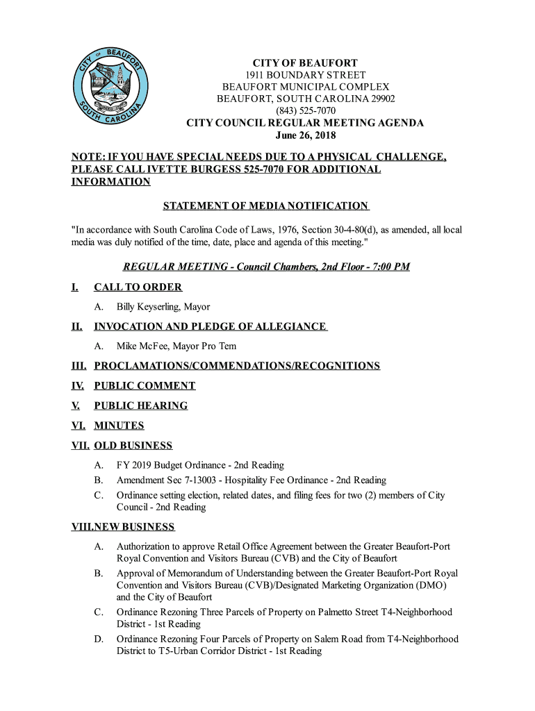 CITY OF BEAUFORT 1911 BOUNDARY STREET BEAUFORT MUNICIPAL COMPLEX BEAUFORT, SOUTH CAROLINA 29902 (843) 5257070 CITY COUNCIL REGULAR MEETING AGENDA June 26, 2018, NOTE: IF YOU HAVE SPECIAL NEEDS DUE