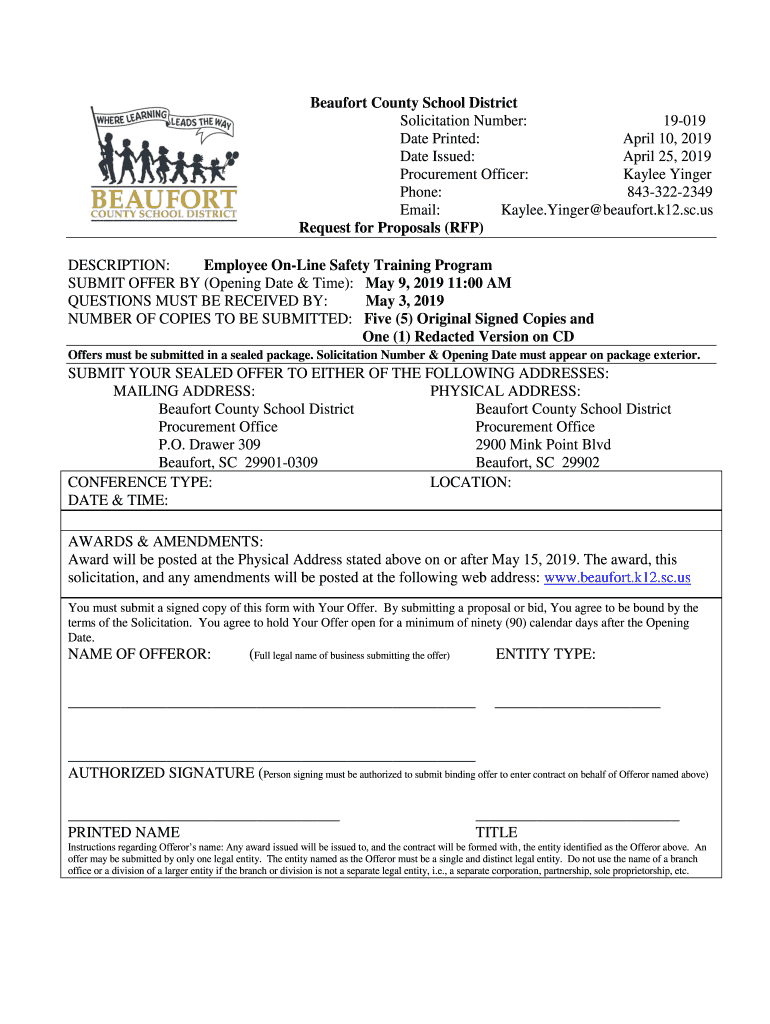 Beaufort County School District Solicitation Number: 19019 Date Printed: April 10, 2019, Date Issued: April 25, 2019, Procurement Officer: Kaylee Singer Phone: 8433222349 Email: Kaylee. Singer Beaufort.k12.SC.us
