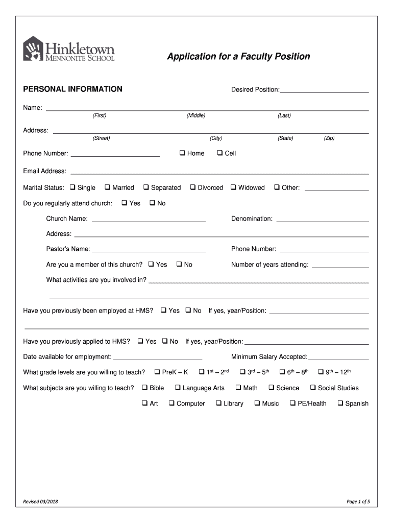 Get the free Application for a Faculty Position - Hinkletown Mennonite School