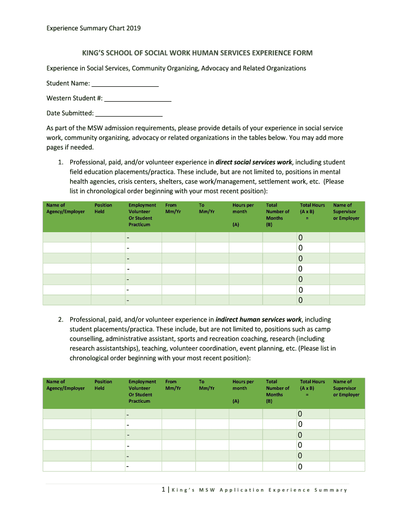 Experience Summary Chart 2019KINGS SCHOOL OF SOCIAL WORK HUMAN SERVICES EXPERIENCE FORM Experience in Social Services, Community Organizing, Advocacy and Related Organizations Student Name: Western