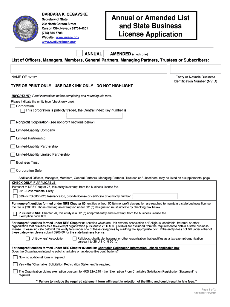 BARBARA K. CEASE Secretary of State 202 North Carson Street Carson City, Nevada 897014201 (775) 6845708 Website: www.nvsos.gov www.nvsilverflume.govAnnual or Amended List and State Business License