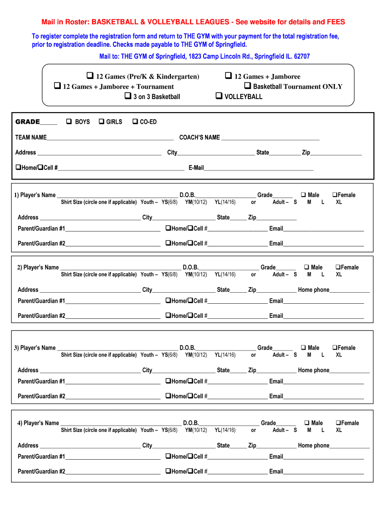 Mail in Roster: BASKETBALL & VOLLEYBALL LEAGUES See website for details and FEES To register complete the registration form and return to THE GYM with your payment for the total registration fee,