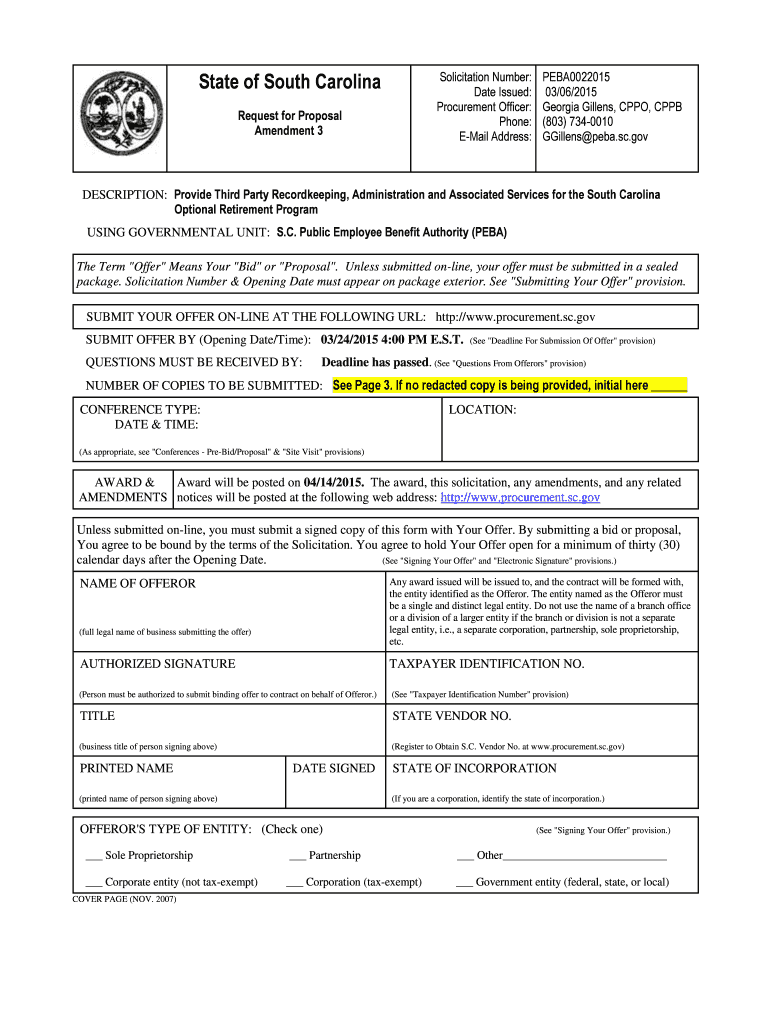State of South CarolinaSolicitation Number: Date Issued: Procurement Officer: Phone: Email Address:Request for Proposal Amendment 3PEBA0022015 03/06/2015 Georgia Gil lens, CAPO, PPB (803) 7340010