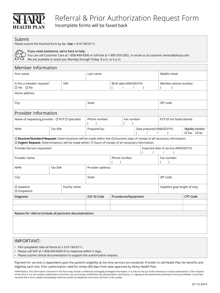 Referral & Prior Authorization Request Form Incomplete forms will be faxed back SubmitPlease submit the finished form by fax. Fax: 16197408111. If you need assistance, were here to help. You can call