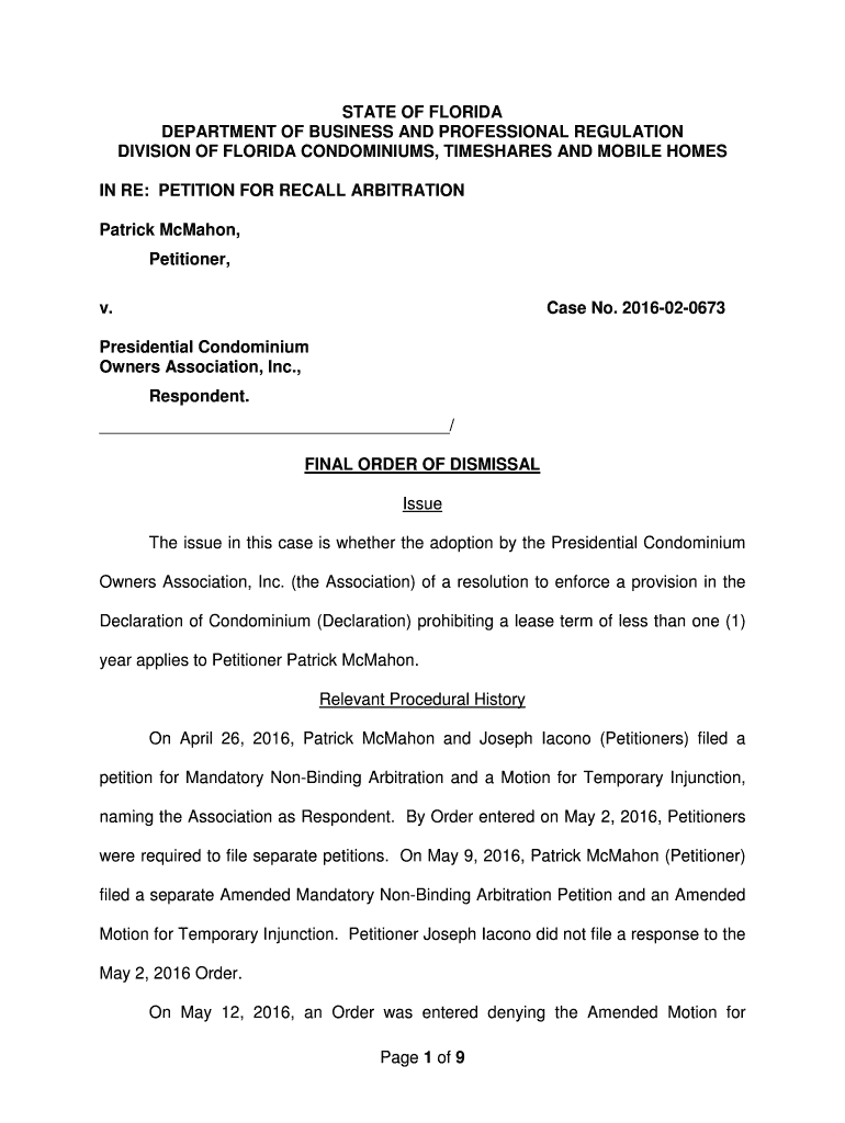 STATE OF FLORIDA DEPARTMENT OF BUSINESS AND PROFESSIONAL REGULATION DIVISION OF FLORIDA CONDOMINIUMS, TIMESHARES AND MOBILE HOMES IN RE: PETITION FOR RECALL ARBITRATION Patrick McMahon, Petitioner,
