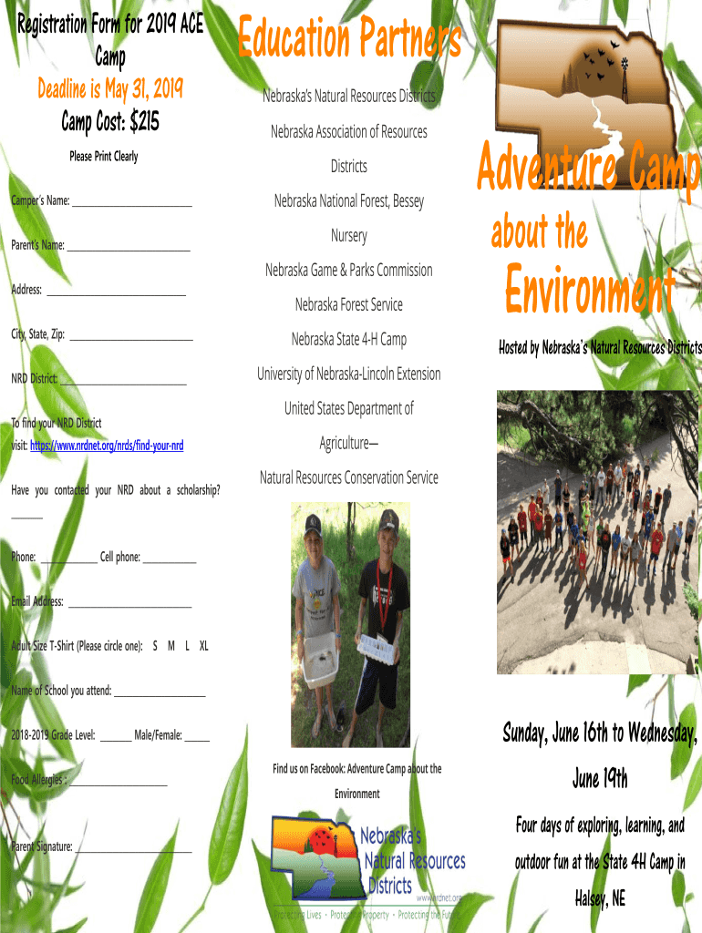 Registration Form for 2019 ACE Camp Deadline is May 31, 2019, Camp Cost: $215 Please Print ClearlyEducation Partners Nebraska's Natural Resources Districts Nebraska Association of Resources DistrictsCampers