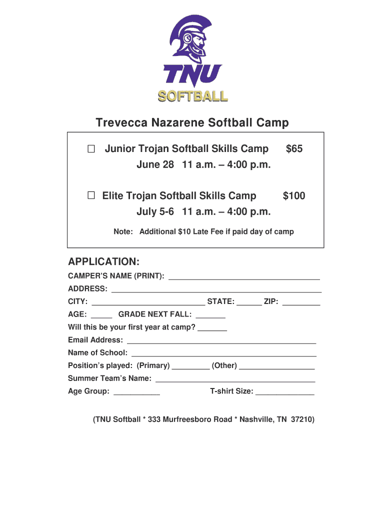 Rebecca Nazarene Softball Camp Junior Trojan Softball Skills Camp×65June 28 11 a.m. 4:00 p.m. Elite Trojan Softball Skills Camp×100July 56 11 a.m. 4:00 p.m. Note: Additional $10 Late Fee if paid