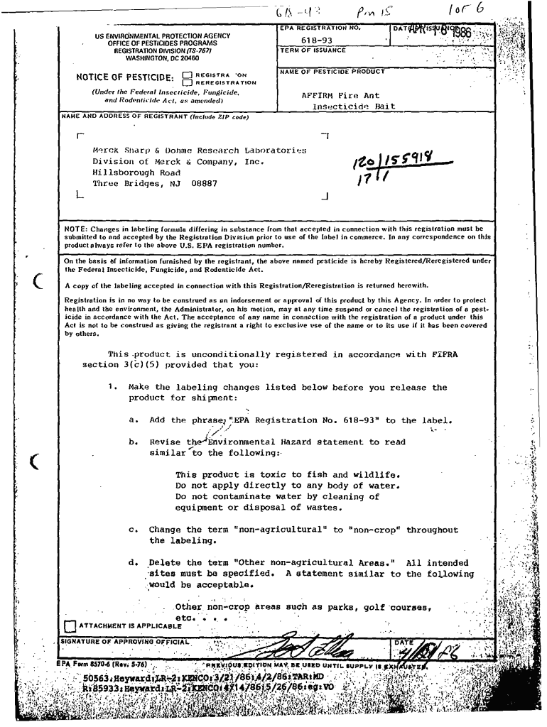 (or us Environmental PROTECTION AGENCYb61893OFfICE OF PESTICIDES PROGRAMS ISSUANCEREGISTRATION DIVISION (lS767) WASHINGTON, DC 20460o notice OF PESTICIDE:REGISTRY. 'PREREGISTRATION(Under the Federal