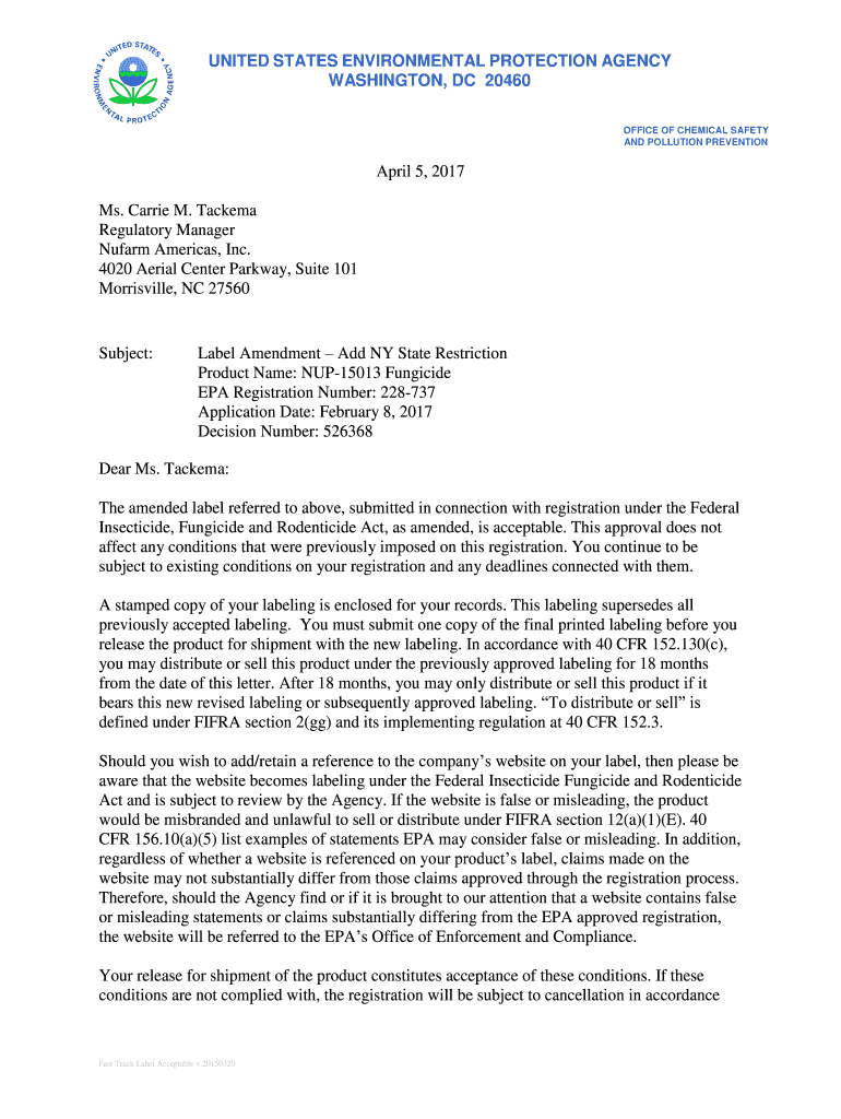 UNITED STATES ENVIRONMENTAL PROTECTION AGENCY WASHINGTON, DC 20460 OFFICE OF CHEMICAL SAFETY AND POLLUTION PREVENTION April 5, 2017, Ms. Carrie M. Tacoma Regulatory Manager Nu farm Americas, Inc.