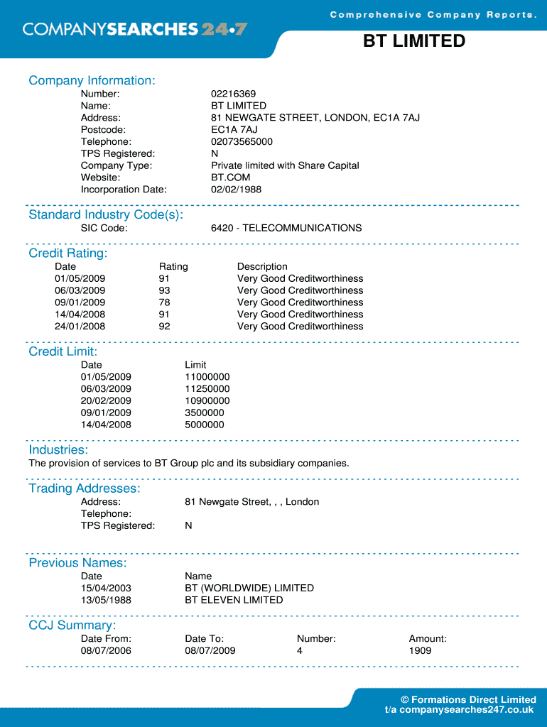 BT LIMITED Company Information: Number: Name: Address: Postcode: Telephone: TPS Registered: Company Type: Website: Incorporation Date:02216369 BT LIMITED 81 NEGATE STREET, LONDON, EC1A 7AJ EC1A 7AJ