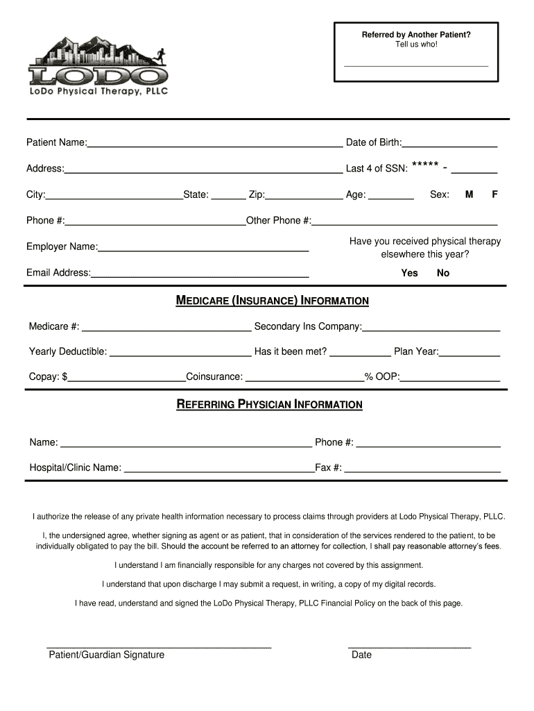 Referred by Another Patient? Tell us who! Patient Name:Date of Birth:Address:Last 4 of SSN:City:State:Phone #:Zip:***** Age:Sex:Mother Phone #: Have you received physical therapy elsewhere this year?
