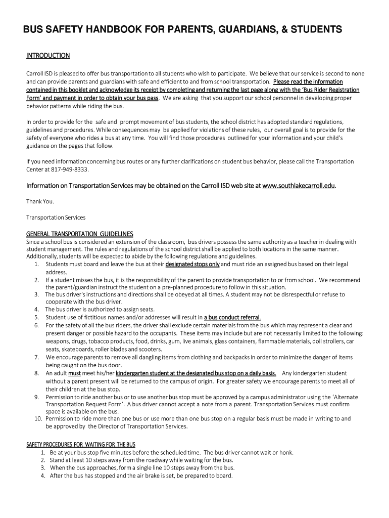 BUS SAFETY HANDBOOK FOR PARENTS, GUARDIANS, & STUDENTS INTRODUCTION Carroll ISD is pleased to offer bus transportation to all students who wish to participate. We believe that our service is second