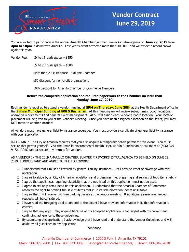 Vendor Contract June 29, 2019, You are invited to participate in the annual Amarillo Chamber Summer Fireworks Extravaganza on June 29, 2019, from 4pm to 10pm in downtown Amarillo. Last year's event