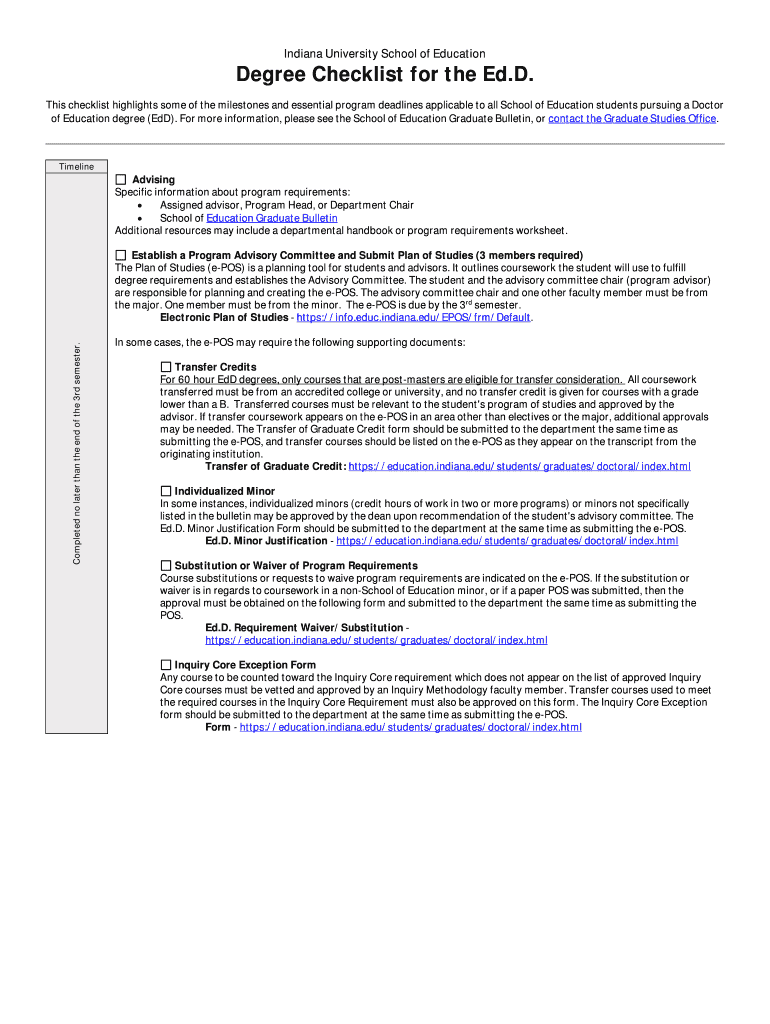 Indiana University School of EducationDegree Checklist for the Ed. D. This checklist highlights some milestones and essential program deadlines applicable to all School of Education students pursuing