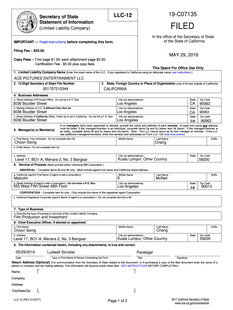 19C07135LLC12Secretary of State Statement of Information (Limited Liability Company)FILEDIMPORTANT Read instructions before completing this form. In the office of the Secretary of State of the State