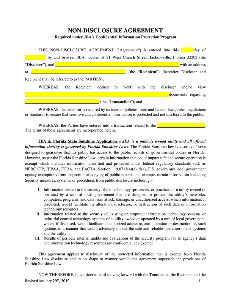 Get the free Non-Disclosure Agreement. Required under JEAs Critical Infrastructure Protection (CI...