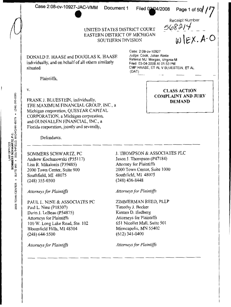 Get the free Donald E. Haase, et al. v. Frank J. Bluestein, et al. 08-CV-10927-Class Action Compl...