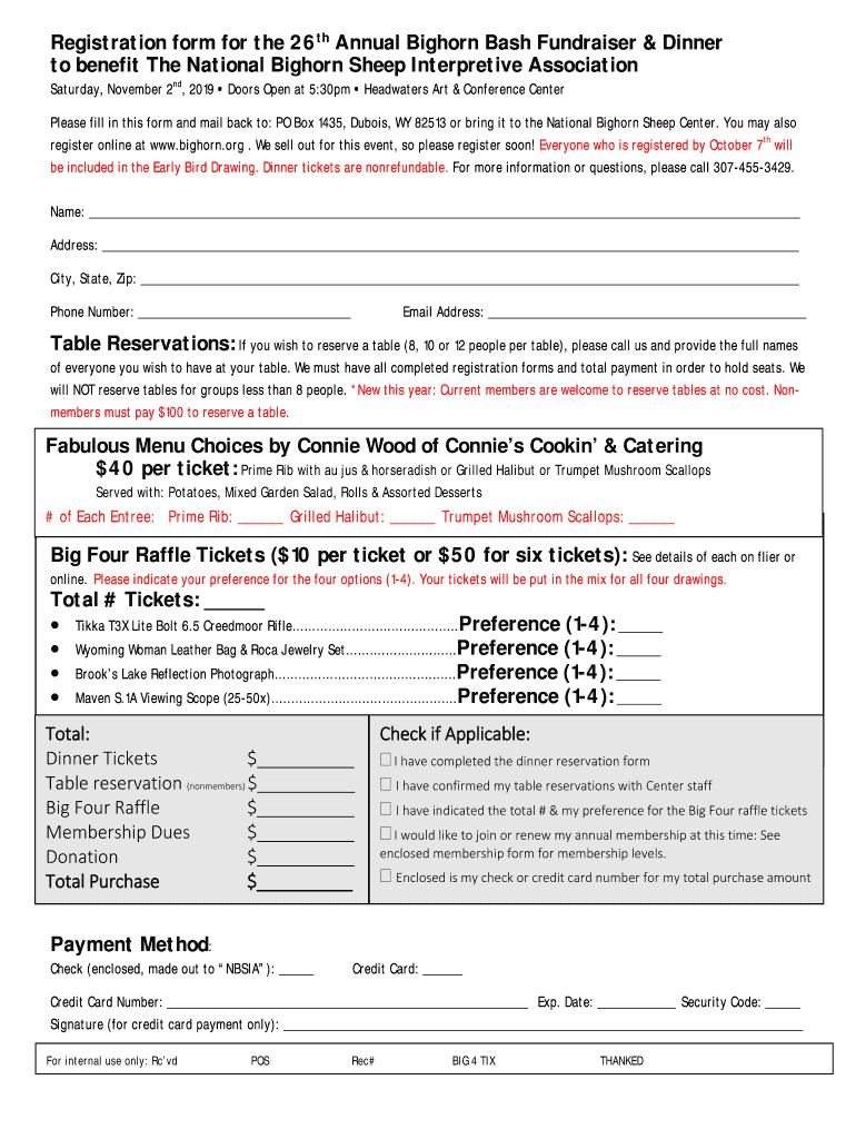 Registration form for the 26th Annual Bighorn Bash Fundraiser & Dinner to benefit The National Bighorn Sheep Interpretive Association Saturday, November 2nd, 2019 Doors Open at 5:30pm Headwaters Art