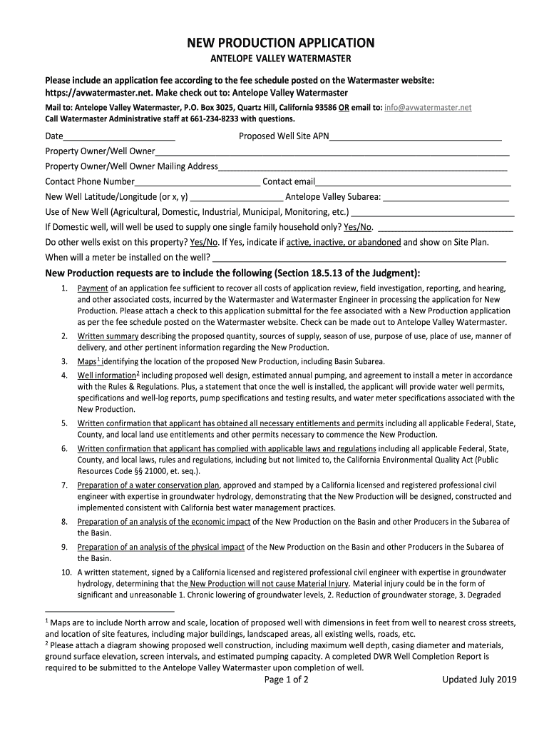 NEW PRODUCTION APPLICATION ANTELOPE VALLEY WATERMASTERPlease include an application fee according to the fee schedule posted on the Water master website: https://avwatermaster.net. Make check out