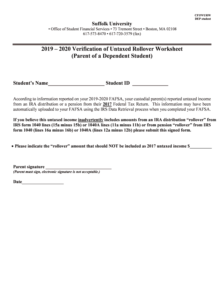 Suffolk UniversityCF19VURW DEP student Office of Student Financial Services 73 Tremont Street Boston, MA 02108 6175738470 6177203579 (fax)2019 2020 Verification of Untamed Rollover Worksheet (Parent