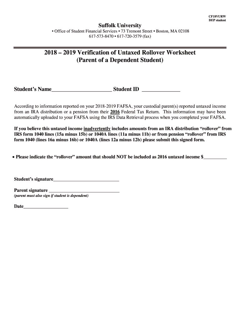 CF18VURW DEP student Suffolk University Office of Student Financial Services 73 Tremont Street Boston, MA 02108 6175738470 6177203579 (fax)2018 2019 Verification of Untamed Rollover Worksheet (Parent