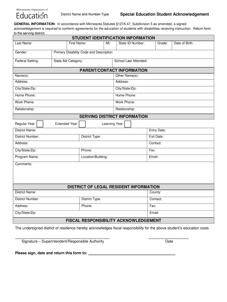 District Name and NumberTypeSpecial Education Student AcknowledgementGENERAL INFORMATION: In accordance with Minnesota Statutes 127A.47, Subdivision 5 as amended, a signed