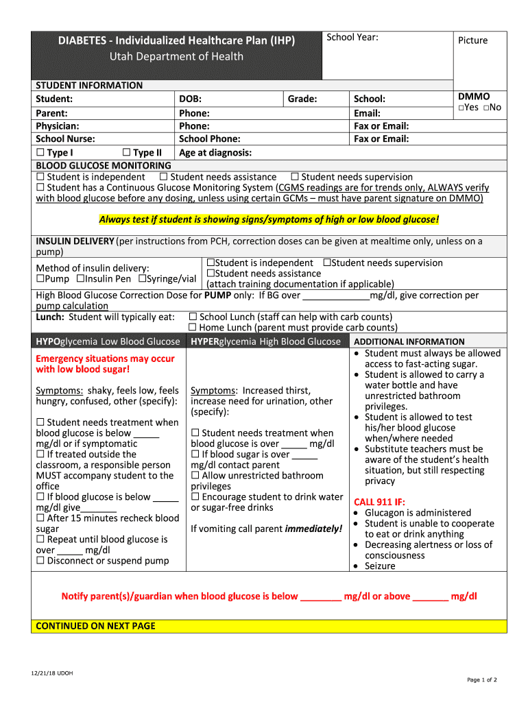 DIABETES Individualized Healthcare Plan (IHP) Utah Department of HealthSchool Year:PictureSTUDENT INFORMATION DEMO Student: DOB: Grade: School: Yes No Parent: Phone: Email: Physician: Phone: Fax or