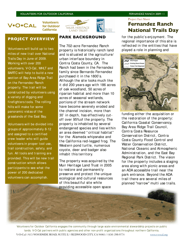 VOLUNTEERS FOR OUTDOOR CALIFORNIAFERNANDEZ RANCH 2009 1Project Fact Sheet Fernandez Ranch National Trails Day PROJECT OVERVIEW Volunteers will build up to two miles of new trail over National Trails