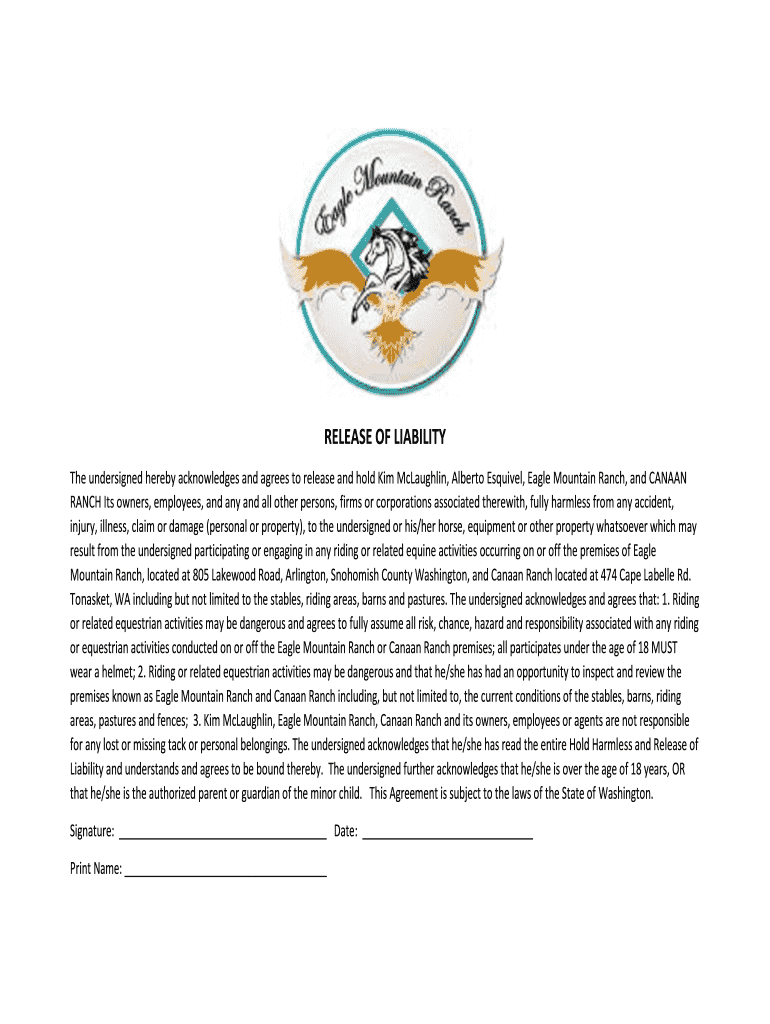 The undersigned hereby acknowledges and agrees to release and hold Kim McLaughlin, Alberto Esquivel, Eagle Mountain Ranch, and CANAAN