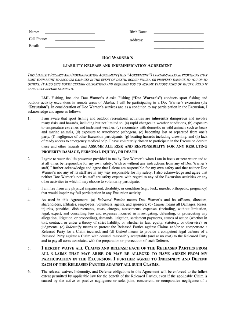 Name: Cell Phone: Email: Birth Date: Address: DOC WARNER LIABILITY RELEASE AND INDEMNIFICATION AGREEMENT THIS LIABILITY RELEASE AND INDEMNIFICATION AGREEMENT (THIS AGREEMENT) CONTAINS RELEASE PROVISIONS
