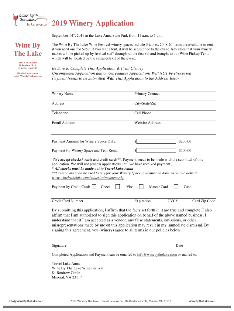 2019 Winery Application September 14th, 2019 at the Lake Anna State Park from 11 a.m. to 5 p.m. Wine By The Lake Travel Lake Anna 84 Renfrew Circle Mineral, VA 23117 WineByTheLake.com info WineByTheLake.