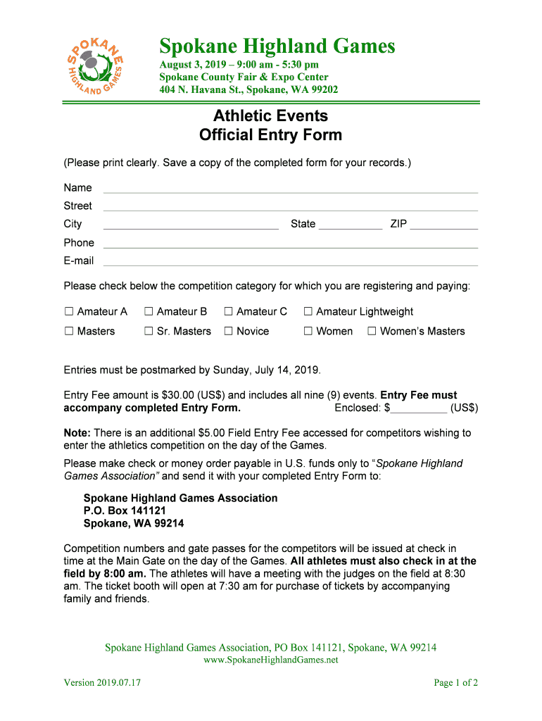 Spokane Highland Games August 3, 2019 9:00 am 5:30 pm Spokane County Fair & Expo Center 404 N. Havana St., Spokane, WA 99202Athletic Events Official Entry Form (Please print clearly. Save a copy of