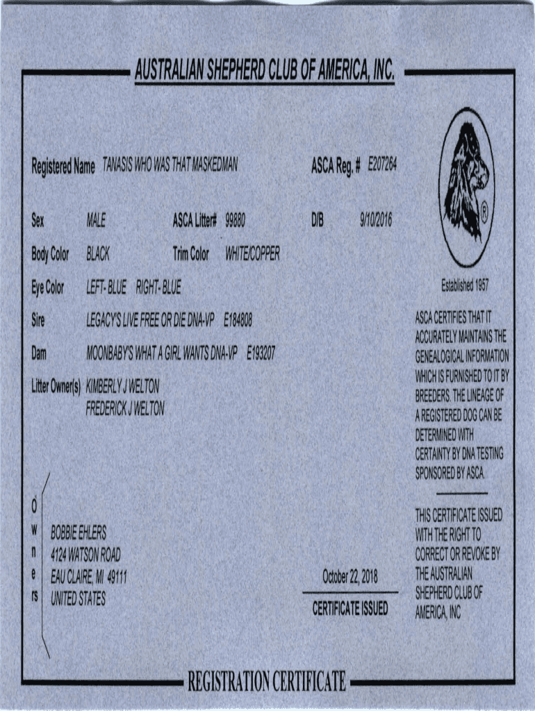 , ....AUSTRALIANRegistered NameSHEPHERD CLU BOF AMERICA,