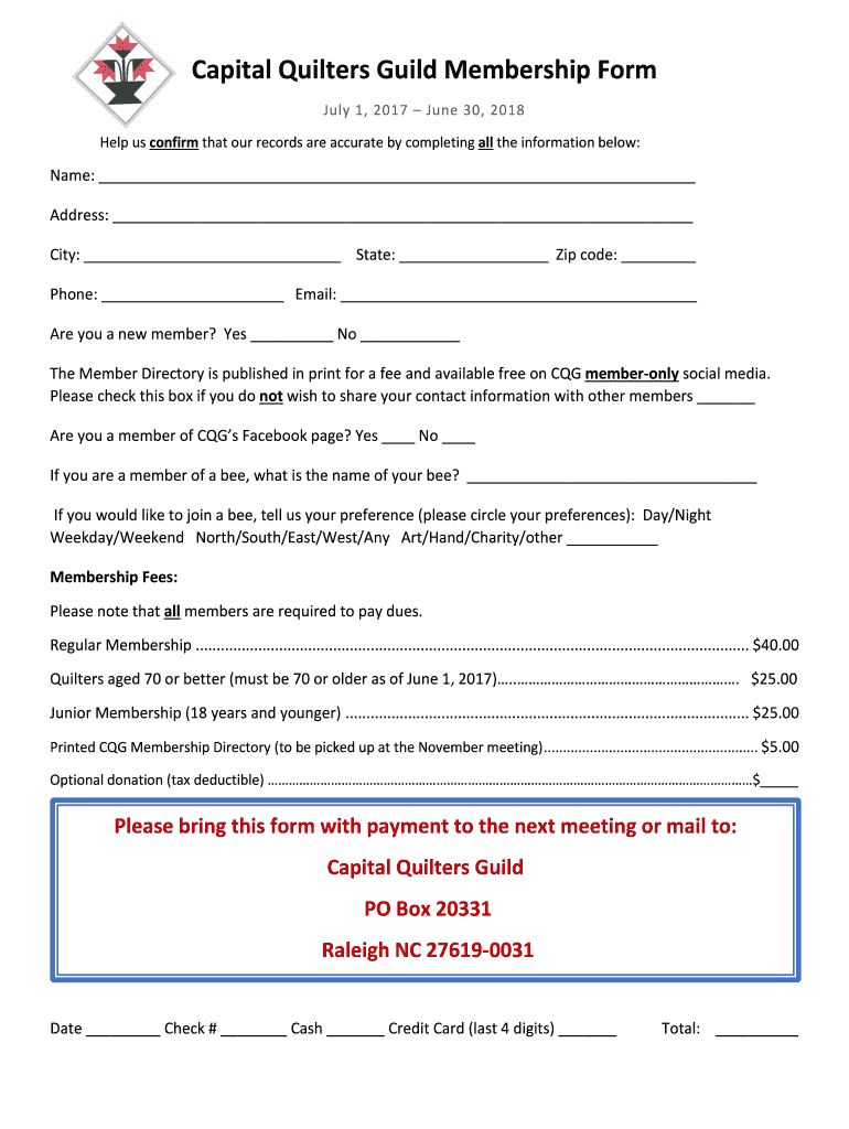 Capital Quilters Guild Membership Form July 1, 2017, June 30, 2018, Help us confirm that our records are accurate by completing all the information below:Name: Address: City: State: Zip code: Phone: