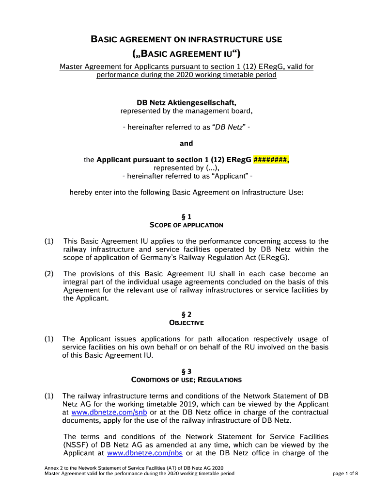 BASIC AGREEMENT ON INFRASTRUCTURE USE (BASIC AGREEMENT IU) Master Agreement for Applicants pursuant to section 1 (12) Gregg, valid for performance during the 2020 working timetable period Net Aktiengesellschaft,
