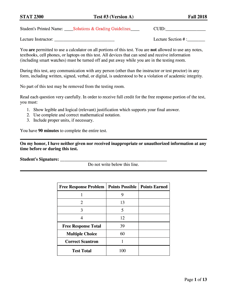 STAT 2300Test #3 (Version A)Fall 2018Student's Printed Name: Solutions & Grading Guidelines QUID: Lecture Instructor: Lecture Section # : You are permitted to use a calculator on all portions of this